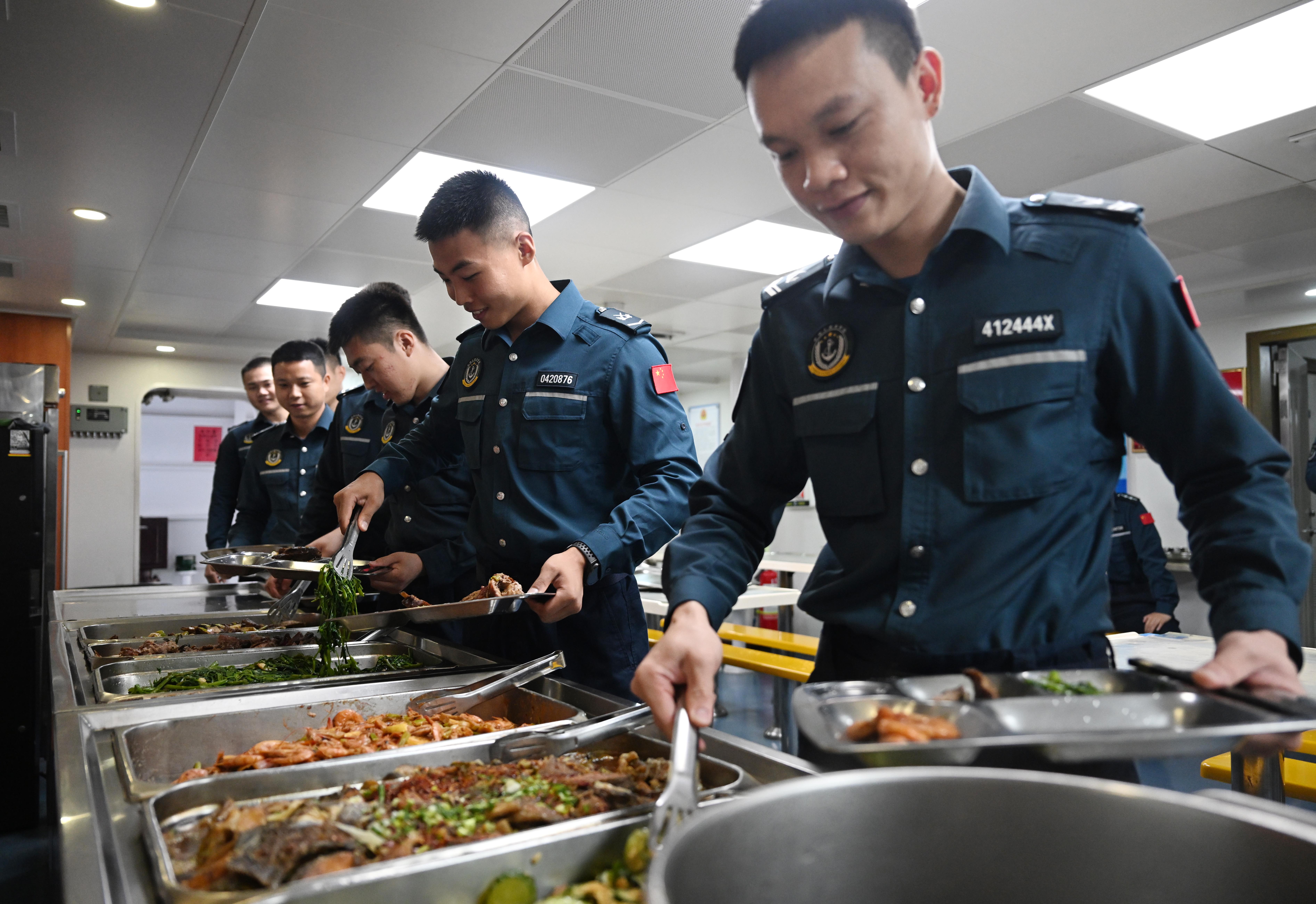 2025年1月1日,在巡航值守于中国南沙群岛仙宾礁附近海域的南薰舰上,海警执法员在排队打晚饭。新华社记者唐健辉摄