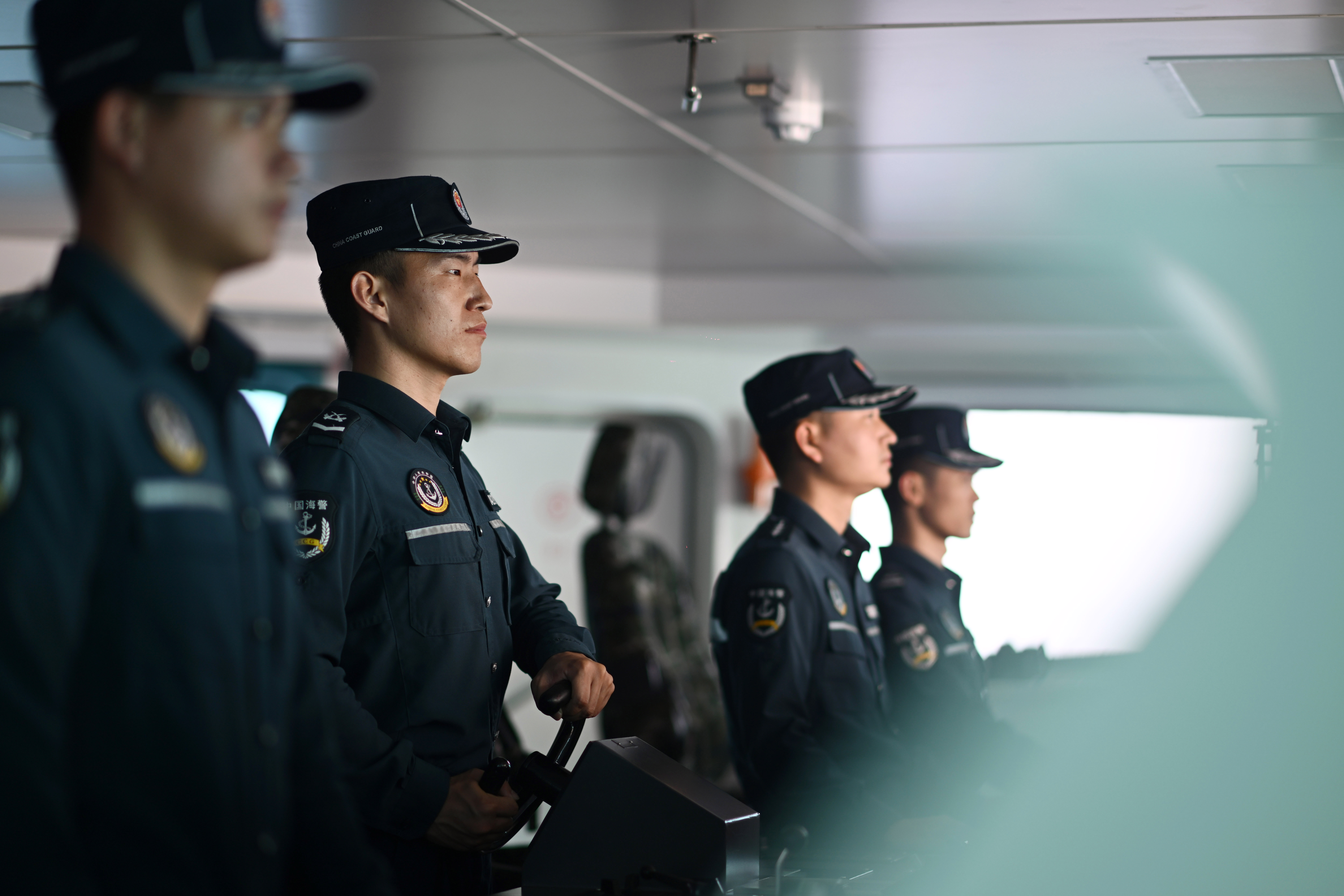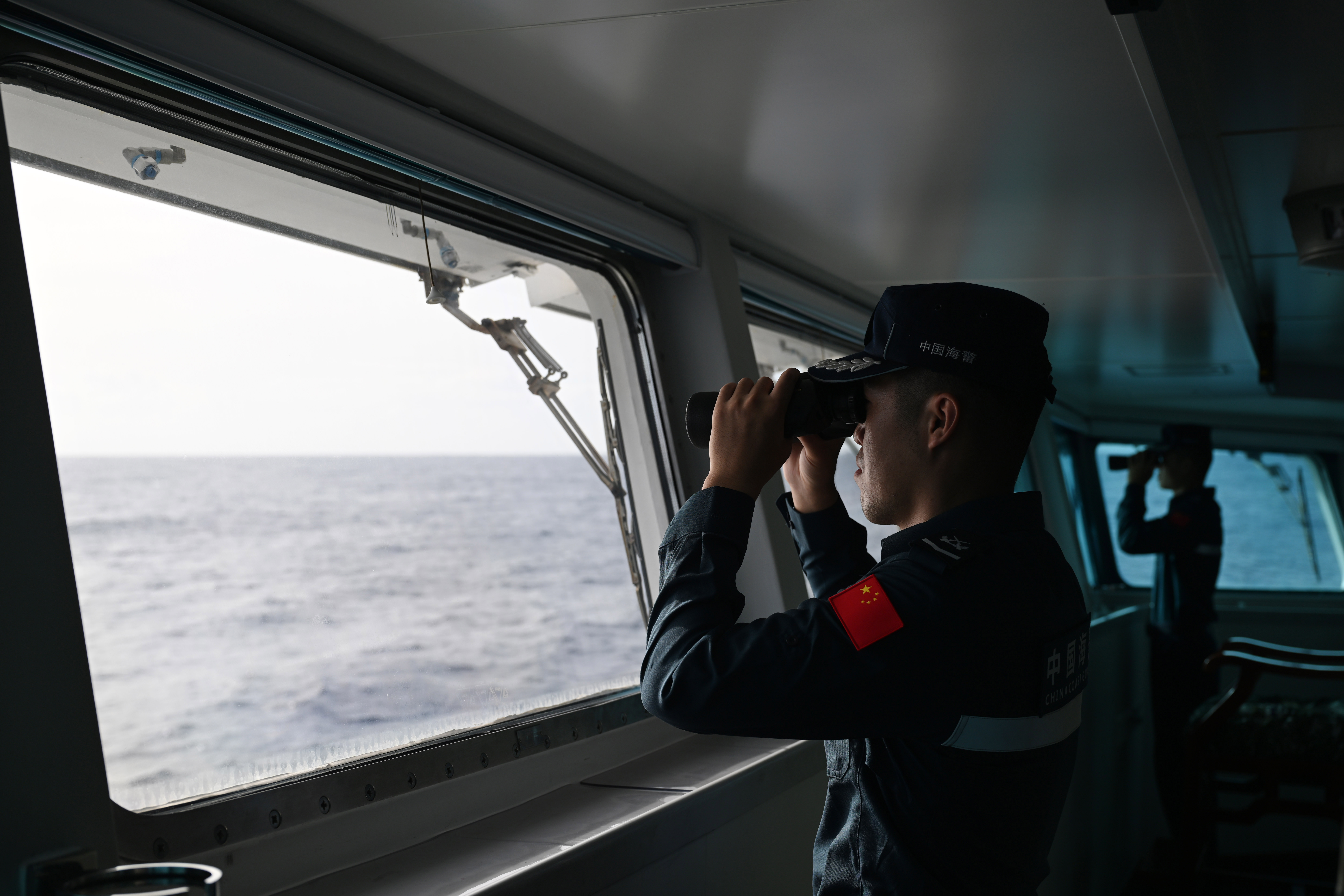 2025年1月1日,海警执法员在位于中国南沙群岛仙宾礁附近海域的南薰舰驾驶室值守瞭望。新华社记者赵子硕摄