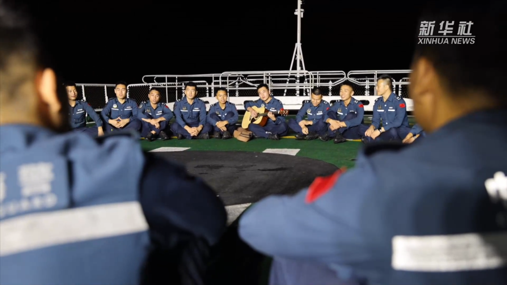 入夜,被灯光照亮的甲板成为一方舞台。地域不同、年龄不同的执法员们将对家人的思念化作歌声表达。
