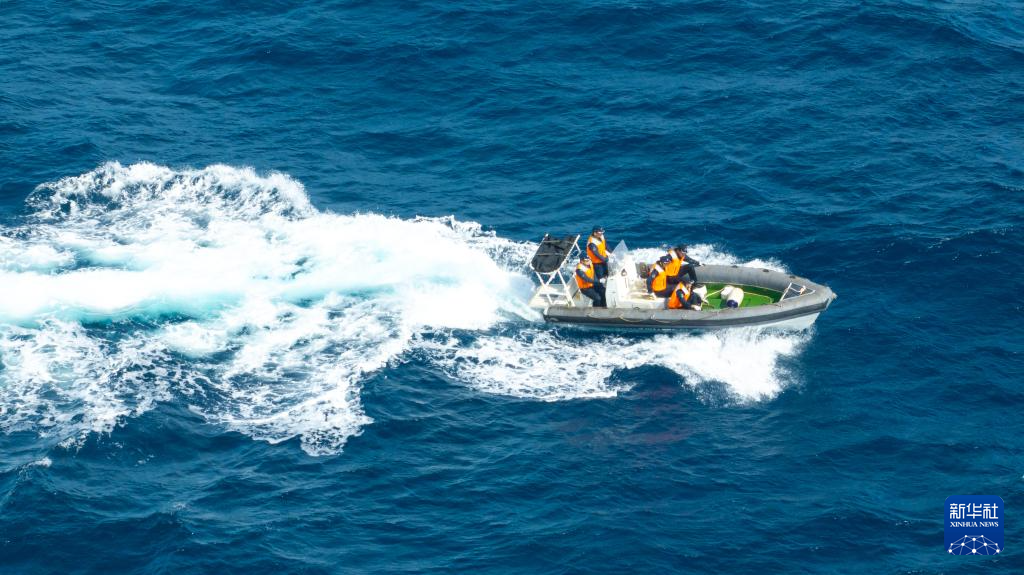 11月14日上午,黄岩舰海警执法员在中国南海黄岩岛海域驾驶小艇执行任务(无人机照片)。