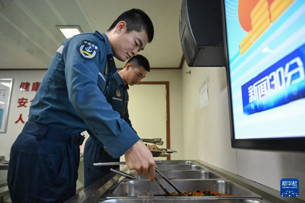 11月26日中午,在巡航值守于中国南海黄岩岛海域的黄岩舰上,海警执法员在餐厅取餐。
