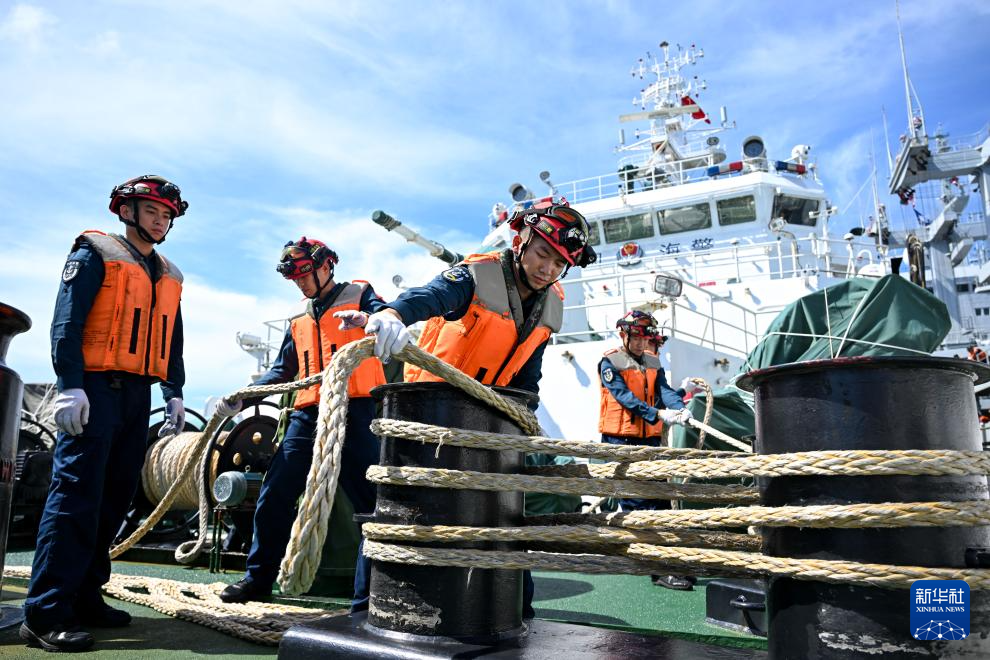 11月30日上午,在巡航值守于中国南海黄岩岛海域的黄岩舰上,海警执法员在甲板进行帆缆作业。
